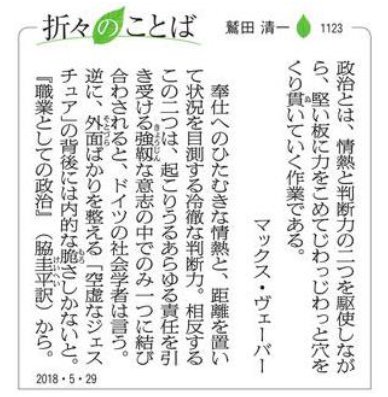 良き官僚は悪しき政治家である ドイツが生んだ世紀を代表する社会科学者 マックス・ウェーバー「職業としての政治」より マックス・ウェーバー 朝礼ネタ・スピーチに名言コラム~バイカー修ちゃん・今日の一言 の名言とエピソードで知るドイツの社会学者 マックス・ヴェーバー 英語と和訳 All knowledge of cultural reality, as may be seen, is always knowledge from particular points of view 文化的な現実のすべての知識は、お分かりのように、特定の見方からの知識である。 池上彰「マックス・ウェーバーの「職業としての政治」は読みました? 進次郎の名言は 政治家も公務員試験みたいに受けさせて一定の教養要求したほうがええわ